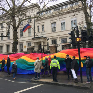 LONDON, ENGLAND - Queer Power Chechen Protest: outside Russian Emabassy In London Jan 2th 2019. QUEER POWER PROTEST against Chechnyan murders this Holocaust Memorial Day Holocaust Memorial Day. Pride In London is the UK’s biggest, most diverse Pride which provides a platform for every part of London’s LGBT+ community (lesbian, gay, bisexual, trans*, queer, questioning, intersex, non-binary, asexual, polysexual, genderqueer and gender variant people) to raise awareness of LGBT+ issues and campaign for the freedoms that will allow them to live their lives on a genuinely equal footing on Jan 27th, 2019 in London, England. (Photo by John Banyard/Pride In London)
